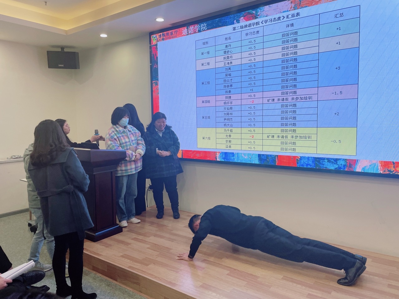結(jié)合上一場培訓(xùn)紀(jì)律的情況統(tǒng)計(jì),依然有學(xué)員因曠課導(dǎo)致扣分,在本場培訓(xùn)的懲罰環(huán)節(jié)中,對比上一場加大了懲罰力度。在培訓(xùn)正式開課之前主持人邀請了存在扣分的學(xué)習(xí)小組成員集體上臺,并由學(xué)習(xí)組長接受體能懲罰,同時,為了讓學(xué)員們更加感同身受,還增設(shè)了燈光和音樂效果,希望通過這樣的方式讓參訓(xùn)學(xué)員能感受到團(tuán)隊(duì)的意義和集體意識,請大家能嚴(yán)格督促自己,建立大局意識,同企業(yè)一起“合力精耕★平穩(wěn)發(fā)展”!